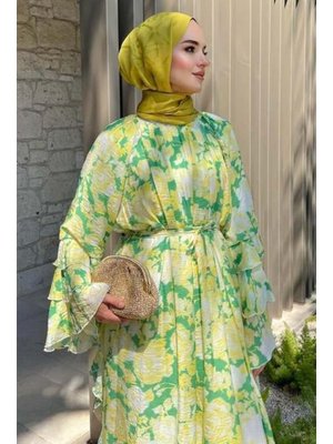 Podyumplus Yeşil Yan Fırfır Detaylı Çiçekli Elbise