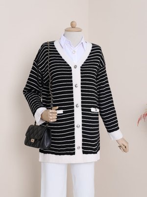 Podyumplus Siyah Cep Detaylı Düğmeli Çizgili Hırka