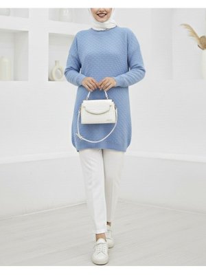 Podyumplus Açık Mavi Yuvarlak Yaka Kabartma Desen Kolu Lastikli Triko Tunik