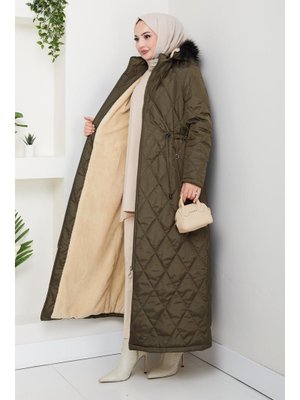 Harmatime butik Uzun İçi Kürklü Kapişonlu Haki Kapitone Mont