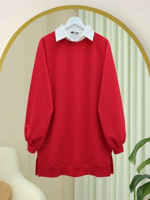 Podyumplus Kırmızı İki İp Yırtmaçlı Parçalı Salaş Penye Tunik