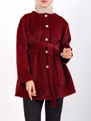 Podyumplus Bordo Düğmeli Beli Bağlamalı Kürklü Ceket