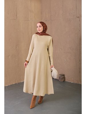 Locco Moda Krem Kendinden Desenli Triko Elbise