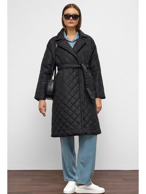 Olcay Siyah Belden Bağlamalı Çıt Kapamalı Kruvaze Kapitone Mont