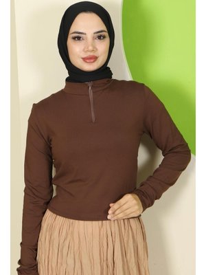 Hafsa Mina Kahverengi Yarım Fermuarlı Body