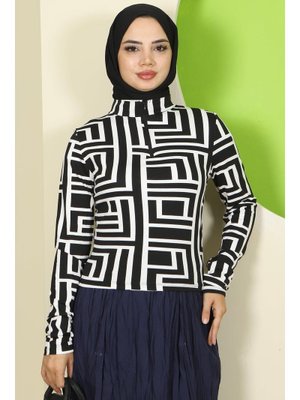 Hafsa Mina Beyaz Labirent Desen Fermuarlı Body
