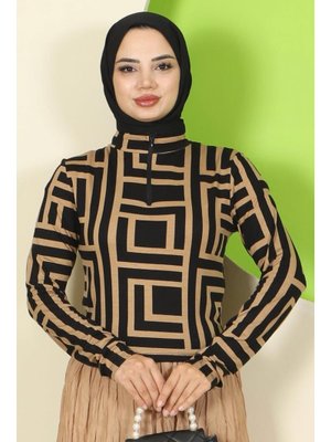 Hafsa Mina Kahverengi Labirent Desen Fermuarlı Body