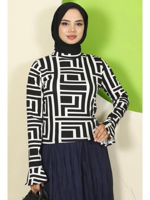 Hafsa Mina Beyaz Labirent Desen Manşeti Volanlı Bisiklet Yaka Body