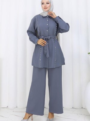 Modamihram Gri İncili Kuşaklı İkili Takım