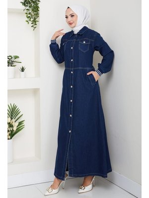 Harmatime butik Cepli Düğmeli Ribana Detaylı Kot Lacivert Uzun Kap