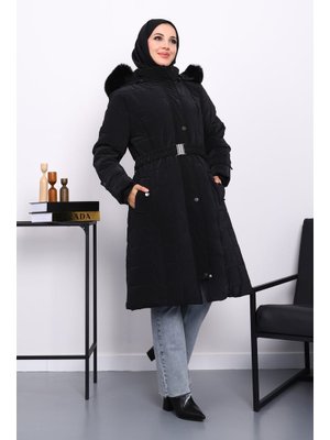 İmaj Butik Siyah Kapüşonu Kürklü Uzun Şişme Mont