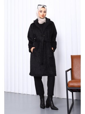 İmaj Butik Siyah Düğmeli Uzun Cepli Kürk Kaban