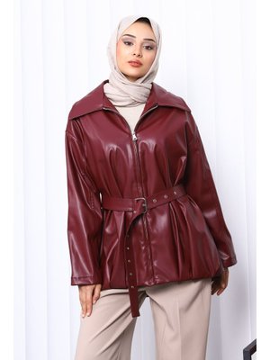 İmaj Butik Mürdüm Kemerli Deri Ceket