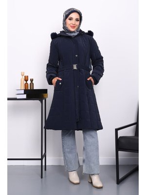 İmaj Butik Lacivert Kapüşonu Kürklü Uzun Şişme Mont