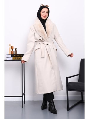 İmaj Butik Taş Yaka Kürklü Kuşaklı Kaşe Kaban