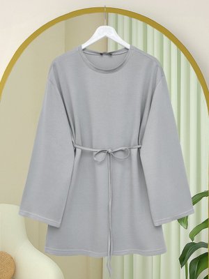 Podyumplus Açık Gri Yuvarlak Yaka Beli Bağlamalı Penye Tunik