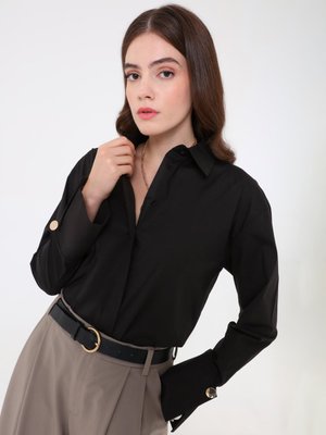 Benin Siyah Geniş Manşetli Gizli Patlı Gömlek