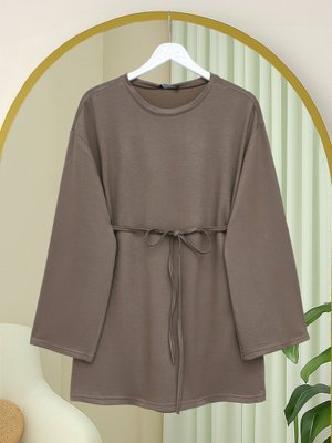 Podyumplus Açık Kahve Yuvarlak Yaka Beli Bağlamalı Penye Tunik