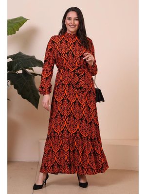 Ferace Turuncu Kadin Hakim Yaka Buyuk Beden Tesettur Viskon Kumas Pileli Ve Piliseli Elbise