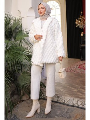 İmaj Butik Ekru Yakalı Çift Cepli Kürk Kaban