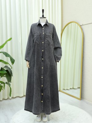 Podyumplus Füme Boydan Düğmeli Kolu Lastikli Cepli Kot Elbise