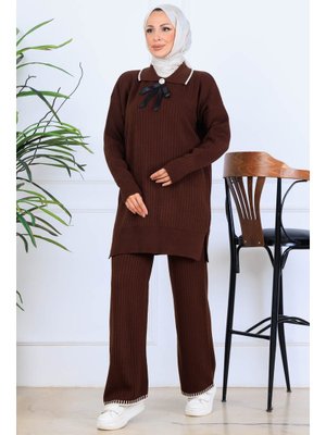 Benguen Kahverengi Yakası Kurdele Detay Triko Takım