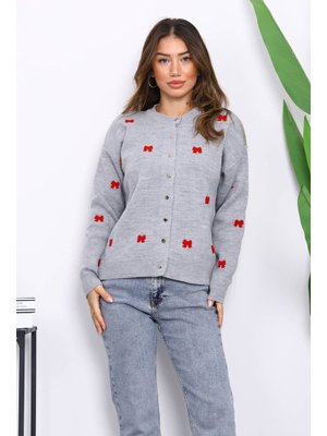 İmaj Butik Gri Fiyonk Nakışlı Triko Hırka