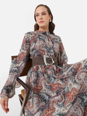 Refka Şal Desenli Önü Patlı Şifon Elbise Yesil