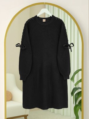 Podyumplus Siyah Omuzu Saç Örgülü Salaş Triko Tunik