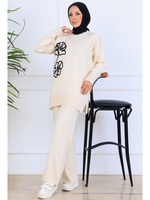 Benguen Taş Rengi Nakış İşleme Detaylı Triko Takım