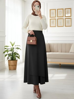 Podyumplus Siyah Önü Çapraz Çift Katlı Scuba Etek