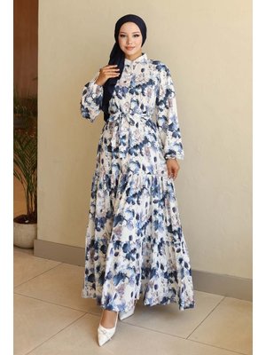 Bigdart Lacivert Desenli Uzun Elbise