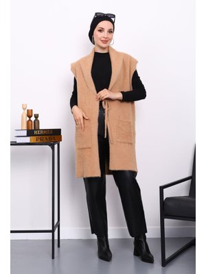 İmaj Butik Bisküvi Ön Bağlamalı Cepli Angora Yumoş Yelek