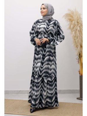 Tesettür Dünyası Siyah Eteği Volanlı Sulu Boya Desenli Viskon Elbise