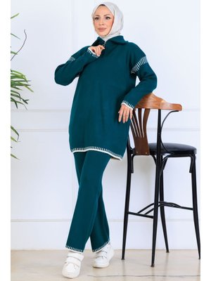 Benguen Zümrüt Yeşili Yakası Fermuarlı Şerit Detay Triko Takım