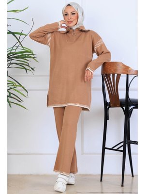Benguen Vizon Yakası Fermuarlı Şerit Detay Triko Takım