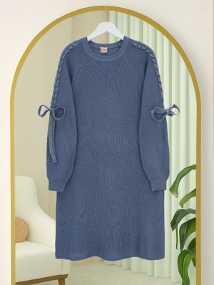 Podyumplus İndigo Omuzu Saç Örgülü Salaş Triko Tunik