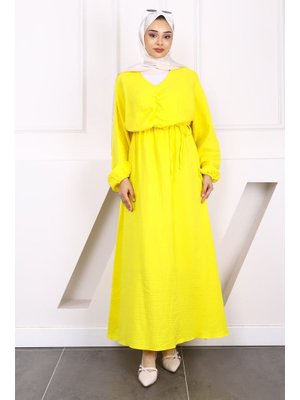 İmaj Butik Sarı Önü Büzgülü Müslin Elbise