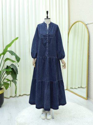 Podyumplus İndigo Yarım Düğmeli Kolu Lastikli Yarasa Kol Kot Elbise