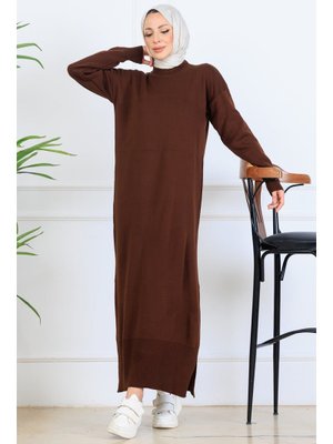 Benguen Kahverengi Yırtmaç Detaylı Triko Elbise
