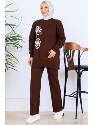 Benguen Kahverengi Nakış İşleme Detaylı Triko Takım