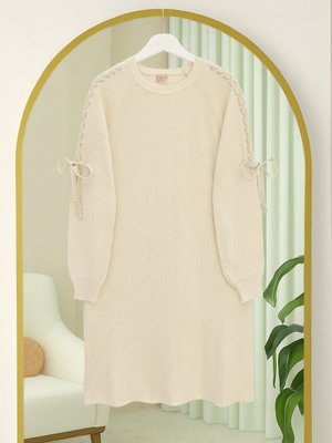 Podyumplus Ekru Omuzu Saç Örgülü Salaş Triko Tunik