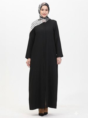 Feraces Siyah Keten Görünümlü Ferace Düz Fermuarlı