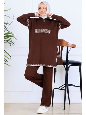 Benguen Kahverengi Yakası Fermuarlı Triko Takım