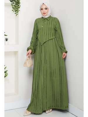 Bestenur Haki Çapraz Bağlamalı Bürümcük Elbise