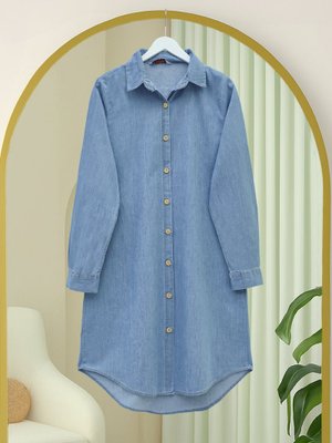 Podyumplus Açık Mavi Ahşap Düğmeli Uzun Kot Tunik