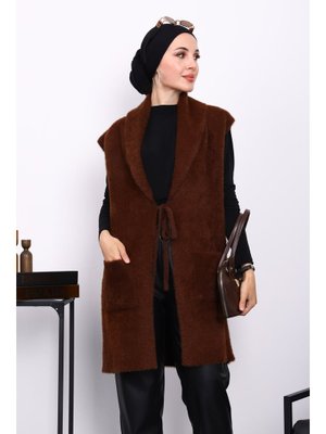 İmaj Butik Kahverengi Ön Bağlamalı Cepli Angora Yumoş Yelek