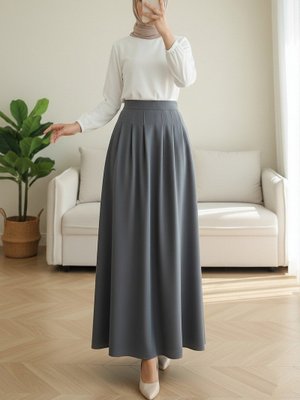 Podyumplus Gri Fermuarlı Cepli Pliseli Krep Etek