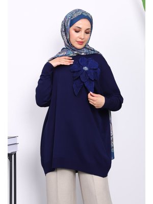 İmaj Butik Lacivert Soğuk İplik Çiçek Detaylı Triko Tunik