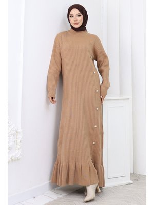 Benguen Vizon Yan Düğmeli Fırfırlı Elbise